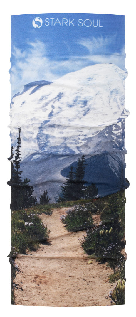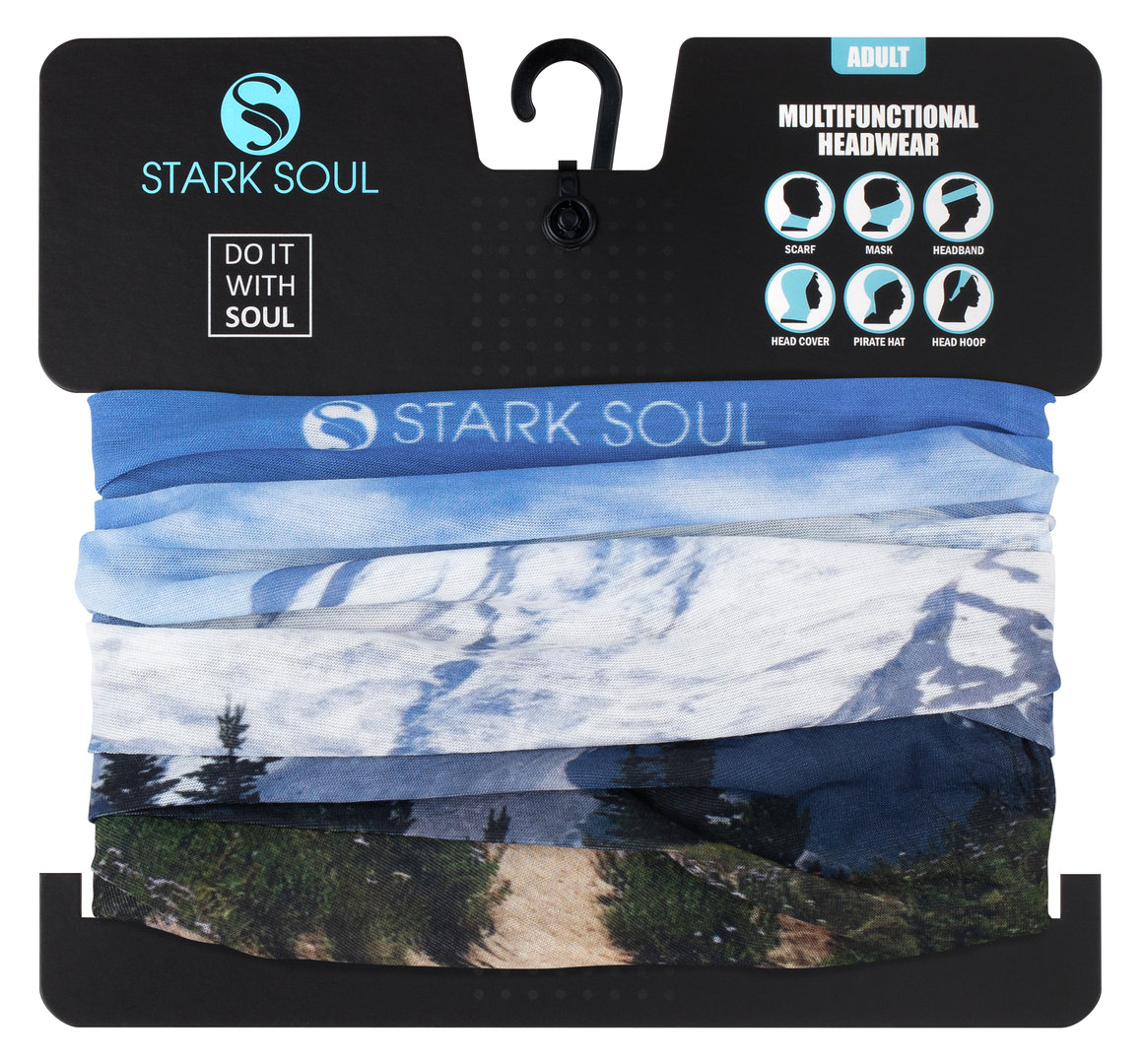 leichtes Halstuch mit weichem Handfeeling durch das schöne Mikrofaser-Material | hautsympathisch | hoher UV Schutz | perfekte Passform durch den angenehmen Stretch | sehr hochwertig gearbeitet | perfekte Klimakontrolle und optimales Feuchtigkeitsmanagement | All-Over-Print mit Landschaft-Motiv und "Stark Soul" Schriftzug | der perfekte Begleiter für Sport oder als modisches Accessoires | multifunktional Einsetzbar als Halstuch, Mund-Nase-Maske, Stirnband, Beanie und vieles mehr