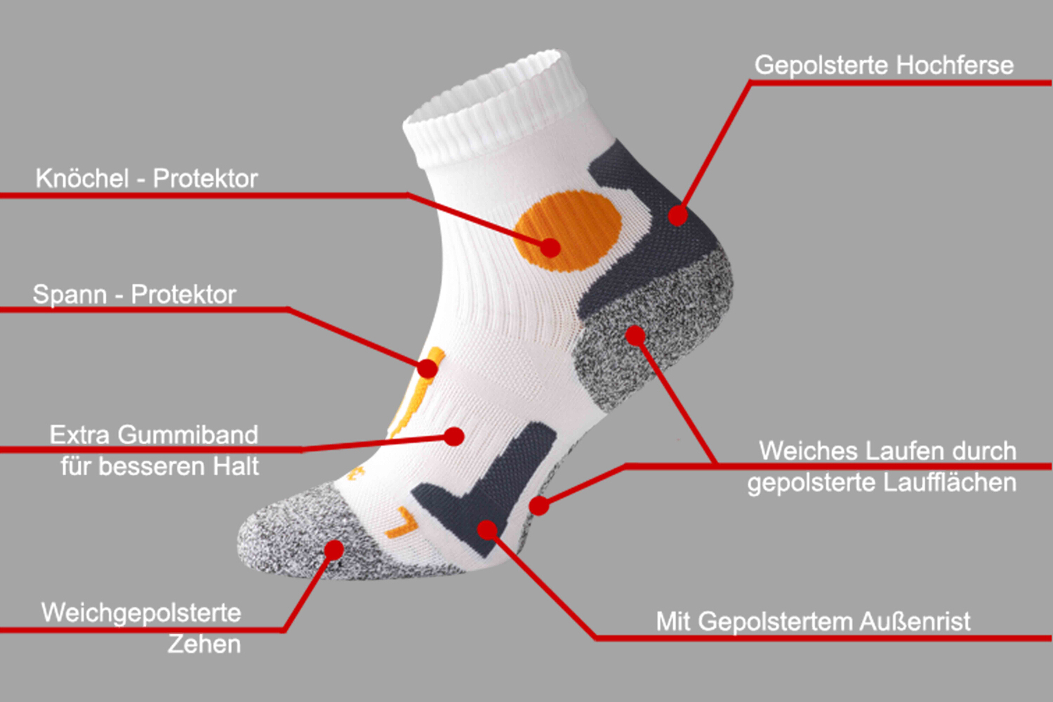 AIR conditioning channels (spezielles Lüftungs-System) | für das Laufen optimierte Protektoren zum Schutz vor Druckstellen und Blasen | Rippbündchen für den perfekten Halt | extrem flache Zehennaht | klimaregulierend, geruchshemmend und ein ausgezeichneter Feuchtigkeitstransport durch den ausgeklügelten Materialmix | schnelltrocknend | faltenfreier Sitz durch Elasthan | verstärkte Sohle um Stöße zu absorbieren | ideal für den Laufsport aber auch bestens geeignet für die Arbeit und Freizeit