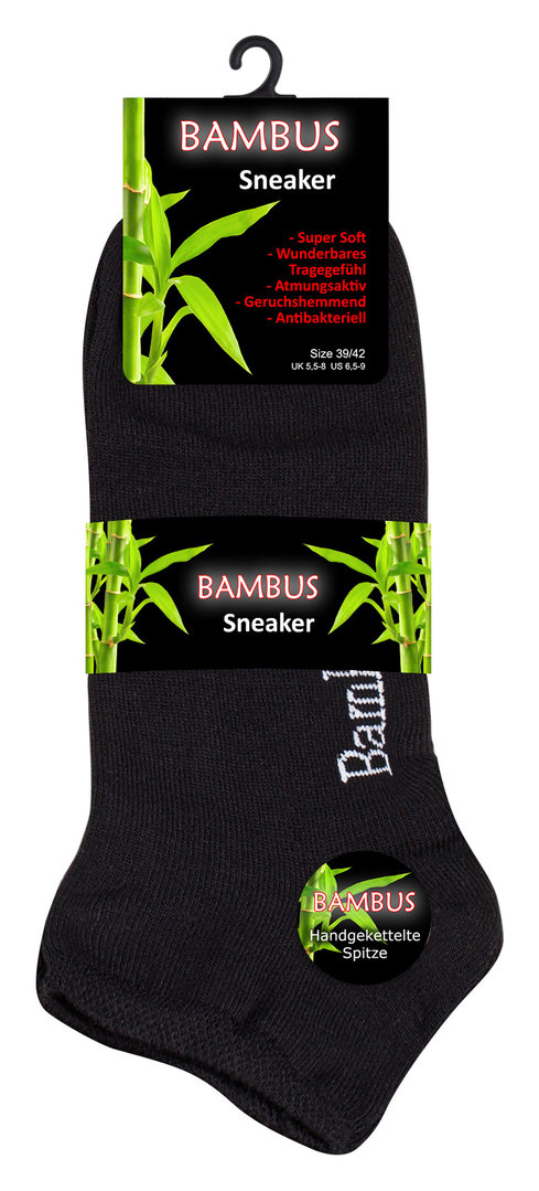 SUPER WEICHE und leichte Sneakersocken | handgekettelte Spitze - keine spürbare Naht an den Zehen | der Softbund verhindert unangenehme Druckstellen | geruchshemmend | faltenfreie und perfekte Passform durch den Elasthananteil | durch die natürliche Wechselwirkung der Bambusviskose, sorgen diese Socken immer für ein ausgewogenes Fussklima | lange Haltbarkeit durch die verstärkte Spitze und Ferse | unifarbene Sneaker mit "Bambus" und Größen-Schriftzug auf der Sohle