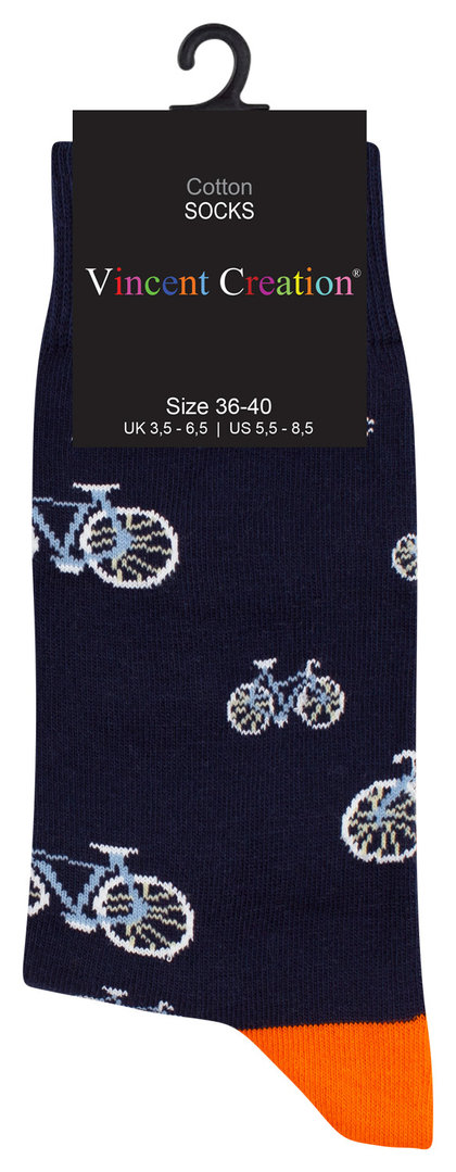 Qualitätsstrumpfwaren von Vincent Creation® | der elastische Komfortbund sorgt für ein angenehmes Traggefühl ohne zu verrutschen | hochwertiges und gleichmäßiges Maschenbild | flache und weiche Zehennaht | klimaregulierend durch den hohen Baumwollanteil | faltenfreie und perfekte Passform durch den Elasthananteil | modische Unisexsocken mit verschiedenen Fahrrad-Motiven | perfekt als MIS-MATCH Socken geeignet