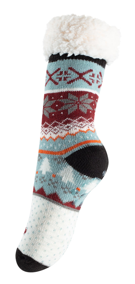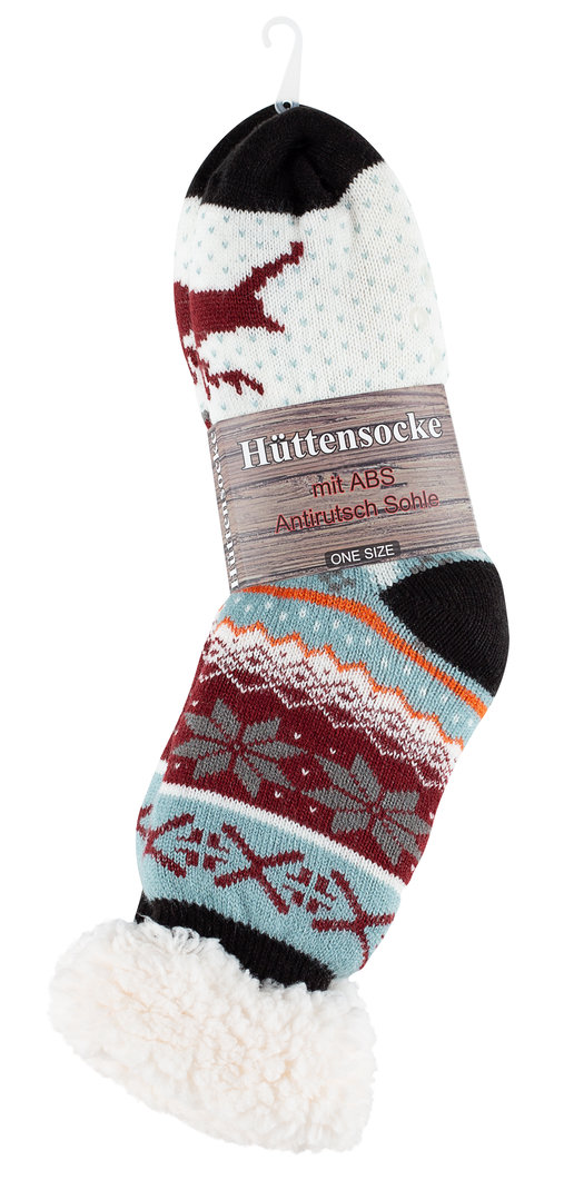der weiche Komfortbund mit Umschlagrand sorgt für ein angenehmes Tragegefühl ohne zu verrutschen | punktförmige Anti-Rutsch-Noppen auf der gesamten Lauffläche | sehr robust | Innenseite mit vollflächigem Lammfell-Imitat | extrem kuschelig und weich für ein unverwechselbares Feeling | schönes Eiskristallmuster mit springendem Rentier auf der Spitze | angenehm wärmend | ideal geeignet als Haus- und Hüttensocken für glatte Untergründe - diese Socken bieten perfekte Stabilität